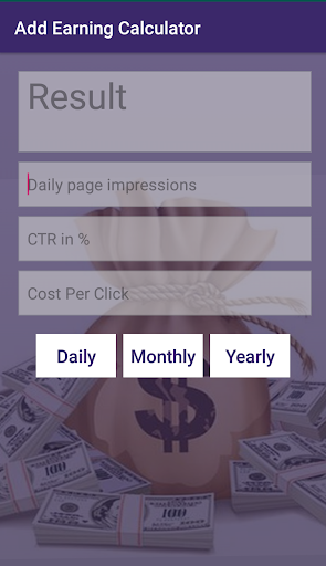 If you enter daily page impression and CTR in percentage and cost per click you will get the result in USD dollar. Here we also added Daily, Monthly and Yearly features.