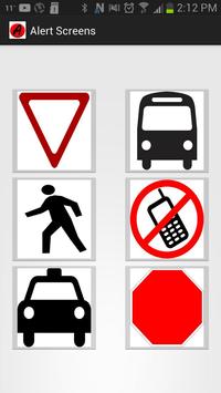 Alert Screens includes a pedestrian crossing sign, a yield sign, a blank stop icon, a bus icon, a taxi icon and a no-cell phone icon.