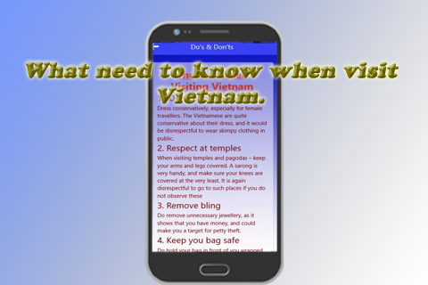 Apps being prepare and ready the booking available for user to come and book their hotels. Search the information of Vietnam and also find the tips when travelling in Vietnam.