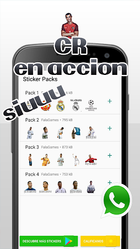 Es sencillo, solo basta con descargar la app de stickers de CR7 a tu dispositivo, y al abrirlo se te despliegan todos los packs de stickers que trae para ti, al entrar en cualquiera puedes ver los que contienen y si te gustan solo los agregas a tu ws con darle al " ", asi de simple.