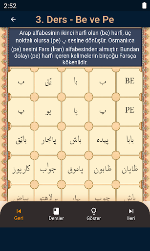 Elinizdeki bu çalışma, Osmanlıcayı hem kolay öğrenmeye vesile olmak hem de öğrenmenin ne kadar kolay olduğunu uygulamalarıyla göstermek için hazırlanmıştır. İçerisinde yüzlerce örnek kelime ve onlarca örnek metinler bulacaksınız. Ayrıca her kelimenin ve metnin Türkiye Türkçesi karşılığı tek tuşla karşınıza çıkacak istediğiniz an yanlış ya da doğrularınızı kontrol edebileceksiniz. Uygulamamızda tüm harfler tek tek incelenmiş, her harf için onlarca örnek kelimeler verilmiş, Türkçede kullandığımız ekler, ismin halleri, bağlaçlar, yapım ve çekim ekleri kısaca dilbilgisi konuları detaylıca anlatılıp örnekler verilmiştir. Osmanlıca Öğreniyorum programımızın içerisinde ayrıca, Kuran Elif Ba sı, Namaz Sureleri, Esmaül Hüsna, Dualar, Salavatlar gibi pek çok uygulamamıza da bağlantılar bulabilirsiniz.