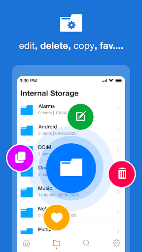 allows you to copy, move, rename, delete or share files to and from any of your storages. It also lets you browse and access your files by category.