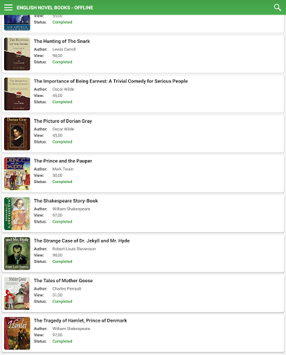 This app provides you a large and fine collection of the public domain Books and Novels in English for everyone with multiple categories and morals. The App is fully functional without the internet. The user interface is very fast and responsive and can be used equally well even in flight mode.