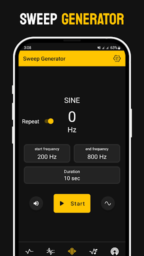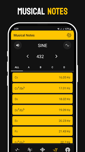 Frequency Sound Generator allows you to easily change the soundwaves from the main menu. Simply tap on the sound wave icon and pick between sine, square, sawtooth or triangle. Additionally, pick from a wide variety of notes by taping the notes 🎵 icon.