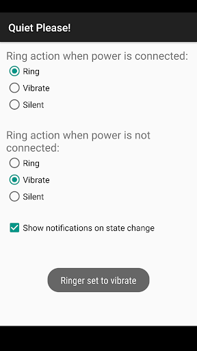 Simple app to change your phone's ringer mode (ring, vibrate, silent) based on whether or not you are connected to a power source.