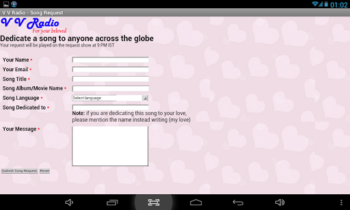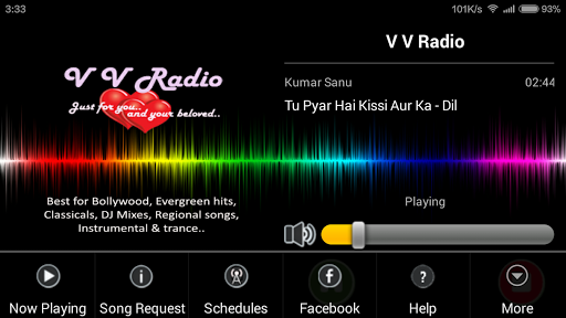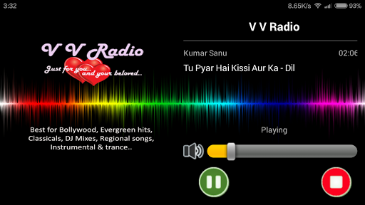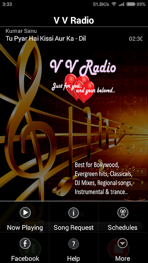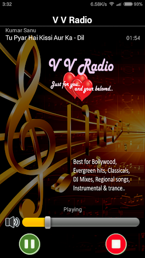 V V Radio is the best selection for you to listen to Hindi evergreen hits, Tamil songs, Kannada Songs, Telgu, Punjabi songs online. Song requests for special events, dedications for your beloved are most on which we look. Stay tuned for evergreen hits back to back. We also tolerate you to participate on music shows as to explore your skills. So why wait. Download V V Radio now. Share our app with your friends today.
