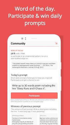 Read poetry and poems from top writers and poets in our community. Our daily writing prompt winners are showcased in the app. Read their poetry and writing and get inspired to write.