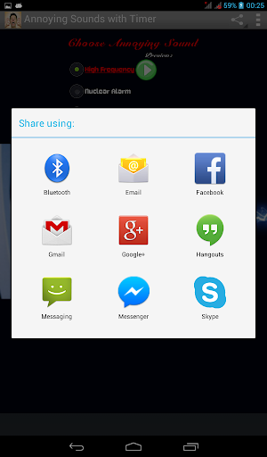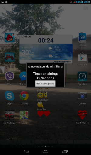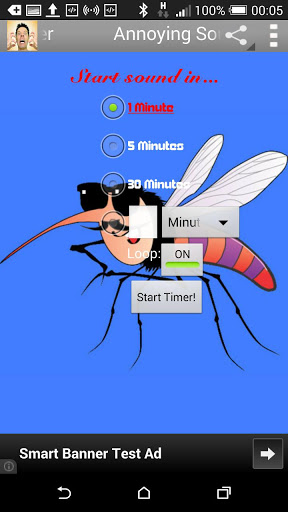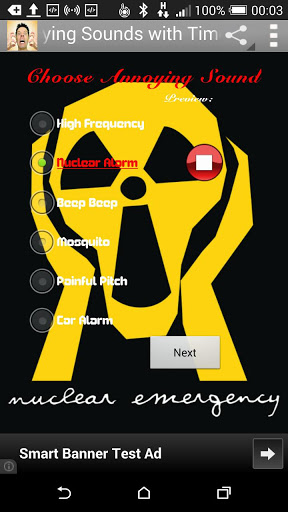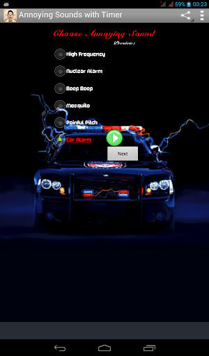 With this app you can annoy your friends, family or other people. The sound effects included are extremely annoying and are disturbing the piece! It is the only app with a build-in Timer so that you can't get discovered when annoying! The sounds included are: High Frequency, Nuclear Alarm, Beep Beep, Mosquito, Painful Pitch and Car Alarm.