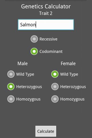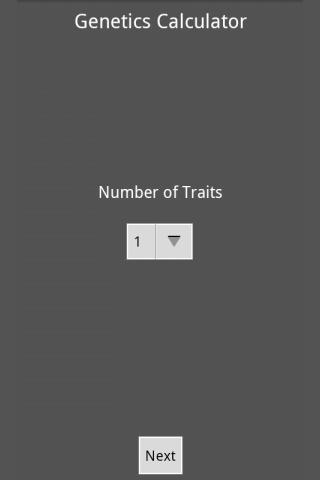 This is the light version of Genetics Calculator. The full version of Genetics Calculator is available on Google Play, and is capable of calculating up to six traits for a possibility of seven hundred and twenty-nine outcomes.