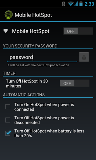 Also you can automatically activate your HotSpot as you connect your phone on AC or USB power. In the same way, as you disconnect your phone from a power source you can automatically turn off the HotSpot application.