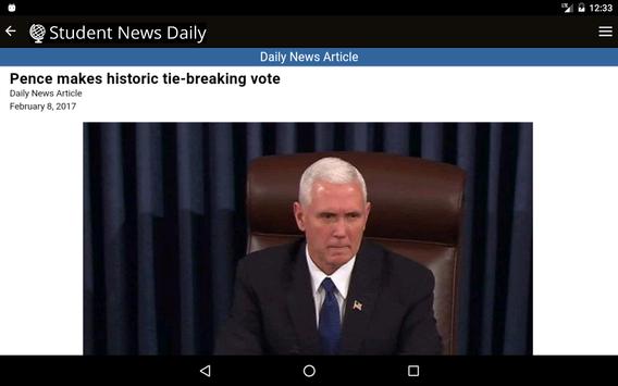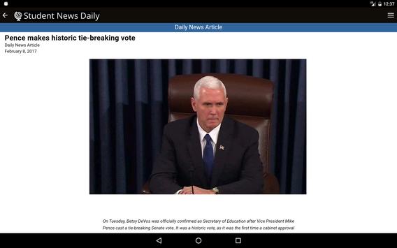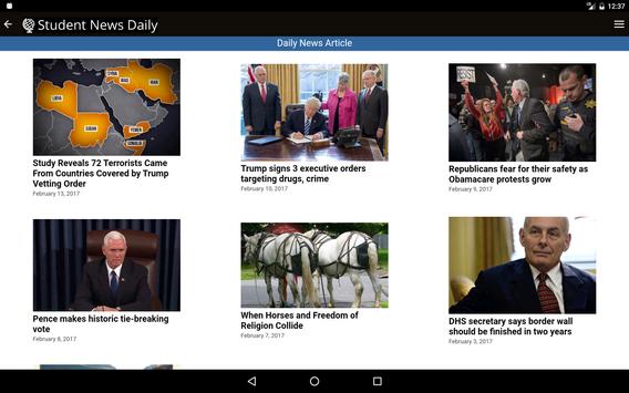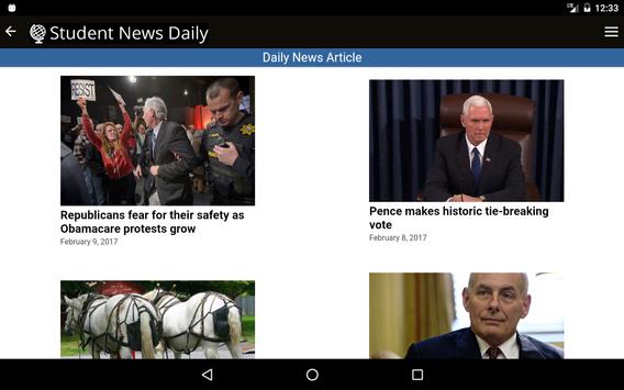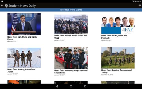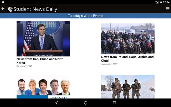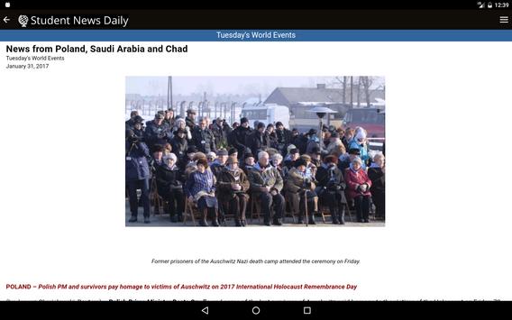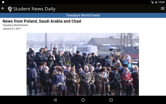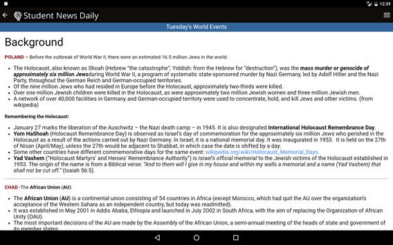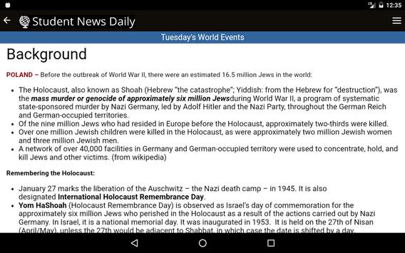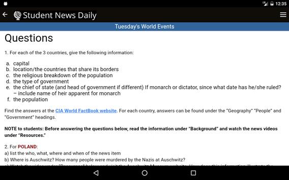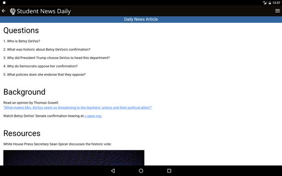 Content categories include a Daily News Article and weekly World Events. Comprehension and critical thinking questions as well as background and resources are provided below the article.