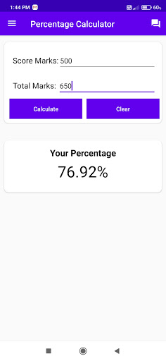 percentage calculator apps free without any money even Very less Space need. In Some Case Your School Percentage Is Wrong Calculate Than You Can Find Actual Percentage Very Easily and increase Percentage. Calculate accurate without any solution it take very low time it save your time to calculate percentage. it help to Calculation
