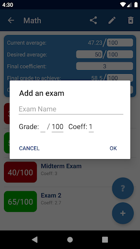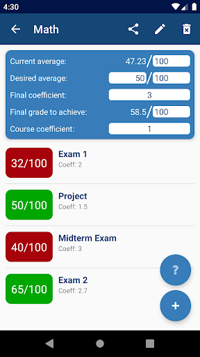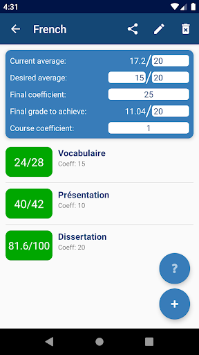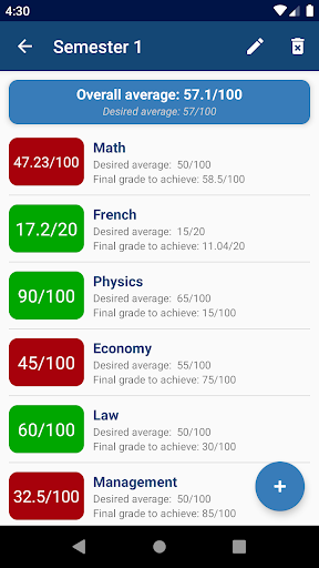 Just enter your desired average and all the grades you already have, along with their corresponding coefficients, and the app computes your average in each course, your overall average for the semester and the passing grades!
