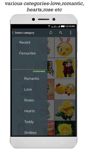 ** Enjoy the different categories of premium free Stickers: Love,Romantic,Rose,Teddy,Hurt, Smiley and Other.