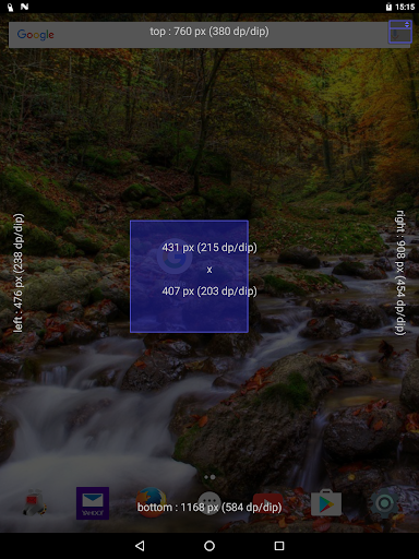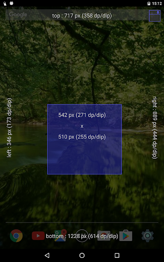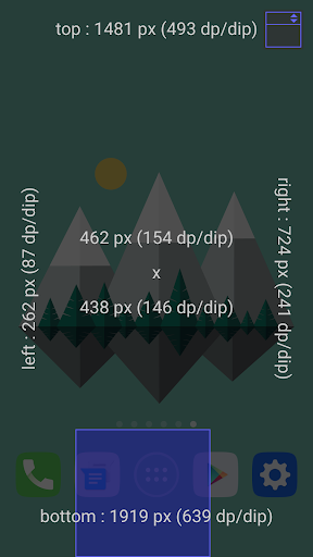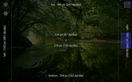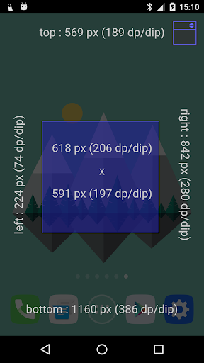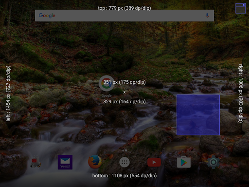 On-screen touch measurement allows you to measure the dimensions of on-screen objects, or get a feel for the sizing of your own app components. A transparent overlay allows you to measure any applications (even the launcher screen).