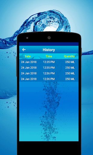 In feature of History, you may see the previous details of water consumption with dates, time and MLs/OZs.