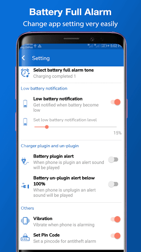 Stop over charging app will also give you an alert when battery reaches to its low level, you can turn on/off this feature from setting and can also set low battery notification level.