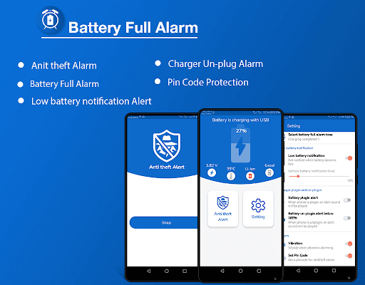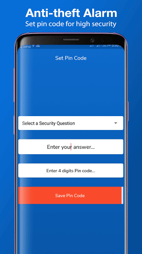 For antitheft alarm you can set a pin code for super protection so that no one can stop the antitheft siren. Battery full alarm app will detect device motion when antitheft mode is activated and when someone touch it or pick it the antitheft siren will be activated.