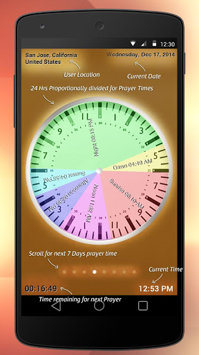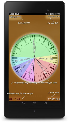 The purpose of Prayer Clock is to remind the users to pray by playing Adhaan when the prayer time is due. It can be used to view next 7 day's prayer timings. It can be used to view the time left for the next prayer. It shows the current Day, Date and Time. It shows the current Location of the user.