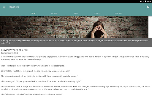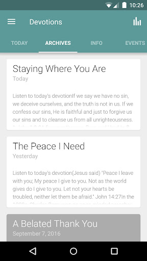 Also be on the lookout for themed devotions delivered through this app, particularly during the Lenten and Advent seasons. After you’ve downloaded and enjoyed the messages, you can share them with your friends via Twitter, Facebook, or email.