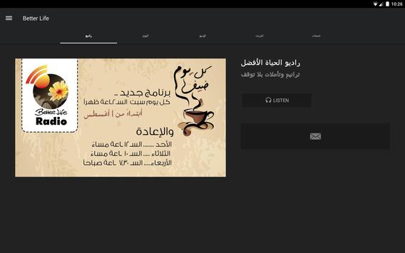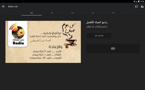 يمكنك من خلال تطبيق الحياة الأفضل الاستماع على مدار ٢٤ ساعة إلى ترانيم، وتأملات، وبرامج روحية وكتابية وأسرية وتشجيعية ومجتمعية. يهتم التطبيق بنمو حياتك الروحية وبتشجيعك وتحفيزك على تنمية علاقة شخصية مع الرب يسوع و تجديد أفكارك وتشكيل مبادئك بحسب فكر الكتاب المقدس. يخدم التطبيق مختلف الأعمار (أطفال- شباب- كبار) ومختلف قطاعات المجتمع (سيدات- رجال- أسر)، كما يقدِّم برامج خاصة لمختلف الجنسيات الناطقة باللغة العربية. يمكنك المشاركة بآرائك وبطلبات خاصة للصلاة أو الاستماع إلى ترانيم محددة من خلال إرسال رسائل نصية عبر الهاتف المحمول أو عبر قنوات الفيسبوك وواتساب.