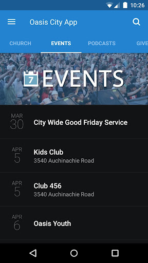 The Oasis City app was developed with the Subsplash App Platform.