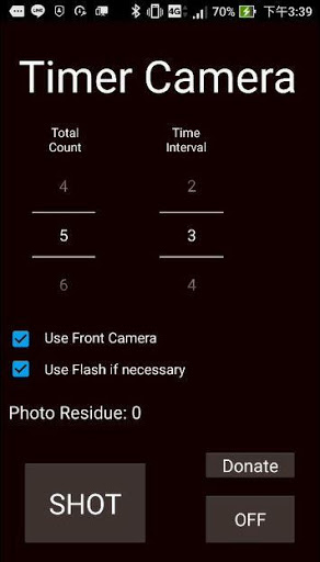Timer Camera (Update) has "front camera" check box to use front camera,