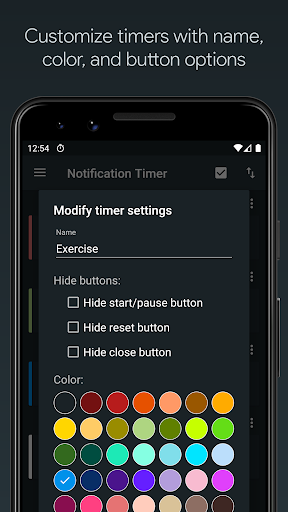 • Customize your timers: You can give each timer a unique display name to make it stand out. Personalize your timers with more than 40 color options. Choose to hide buttons you don't need to avoid accidental resets and dismissals.