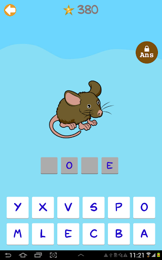 • This screen in unique in that it will predict the name of the image in the picture. At the bottom of the picture, the incomplete spelling of the image is printed. The child has to listen to the way it is pronounced and complete the spelling using a selection of vowels and consonants that are also displayed on the screen. A picture of a table appears on the screen and underneath it, its incomplete spelling appears like _a_l_. Once the child listens to the way table is pronounced, he/she will be able to complete the spelling using the selection of vowels and consonants that are on the screen.