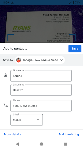 Contact Scanner will also give you the option to add as new contact with name if visible on the scanned document, you can directly call or mail from any stored cards, you can also scan any mail address to mail.