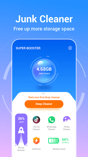 💞Download Super Booster and make your Android phone faster and smoother, Effective clean junk files and boost speed. Provide you with simpler and faster mobile phone cleaning and acceleration services.