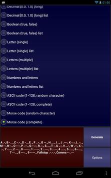 Random number generator - Generoutta is an application that allows the user to generate randomly and/or lists of: letters, ASCII code characters, Morse code characters, numbers, words, numbers and words, long/short integers, decimals,... and you can share the results easily and fast.