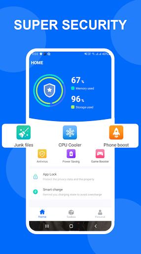 Super Security - Antivirus, Cleaner, Booster provides mobile security and virus protection for your mobile devices. Super Security protects your mobile device, your data, and Privacy. Stay ahead of phishing attacks and mobile breaches with Super Security app.