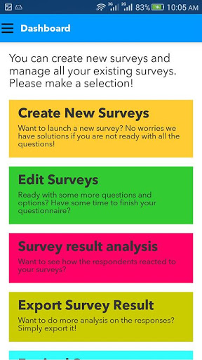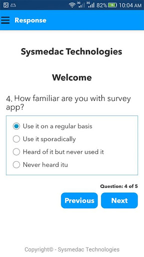 Survey App is the best free app for your all survey, quiz and poll needs. Survey App lets you to create and conduct your surveys, quizzes and polls with either open or by invitation mode. The survey response can be done offline mode as well. Apart from analyzing survey results in the app, you can export to excel for further analysis. You can also share your survey through WhatsApp , Facebook to gain more responses.