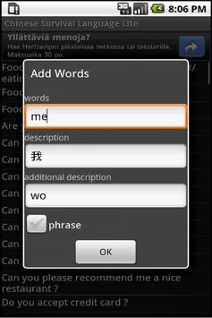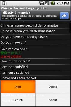 Chinese Survival Language™ Lite - Free version. Presented by SurvivalTravel.com. A simple easy to use Chinese Mandarin language guide. Contains conversations and essential words, and allows user to add or delete phrases and words. Around 2000 phrases and words. The ultimate survival Chinese Mandarin language. A language guide for China Travel.