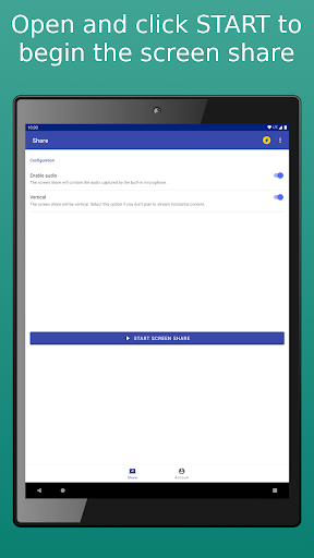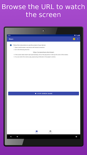 - Screen sharing with other mobile devices (open the URL that the app gives you on the another device)