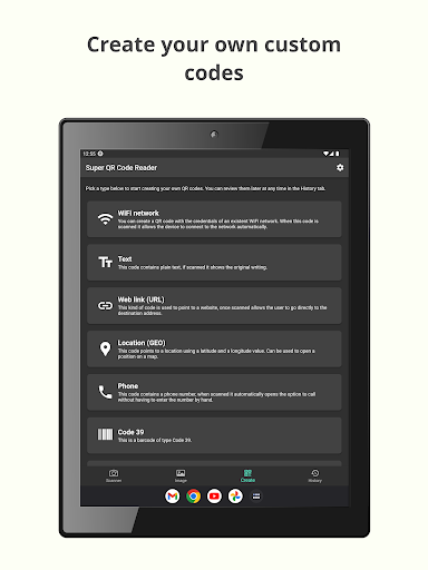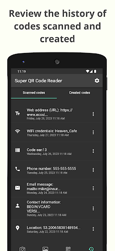 Super QR Code Reader is a QR code scanner and barcode reader that will allow you to read any code you find using your device's camera or by scanning an image. In addition, this application is also a QR code generator and barcode generator, so you can create your own personalized QR codes and barcodes with the data you enter.