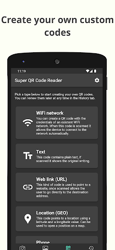 Of course! Super QR Code Reader is not only a scanner app for reading and detecting QR codes, it also has a QR code generator function. To use it as a QR code creator, go to the creation tab where you will see all the different types of QR codes that you can generate. Once the data is entered, the barcode generator function will create the code. Then, this code will be stored in your history section, where you can view it, execute your action, or share it.