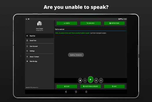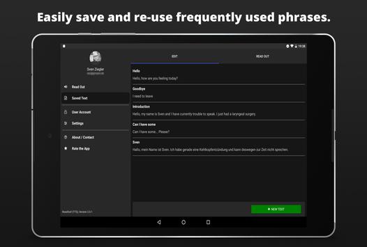 Currently or long-term not able to speak? If you just had a throat surgery or are suffering from a laryngitis, speaking is not possible. "ReadOut!" will reliably help you with the communication with people around you. Save often used texts and synchronize them all on your Android devices (Premium function).