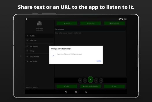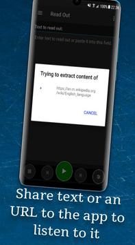 Found an interesting website (URL)? Just share it with "ReadOut!". The app extracts the contents of the page and reads it for you. Supported apps are Google Chrome browser, Medium, Feedly, many Twitter apps and every single app that supports the sharing of an URL.