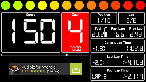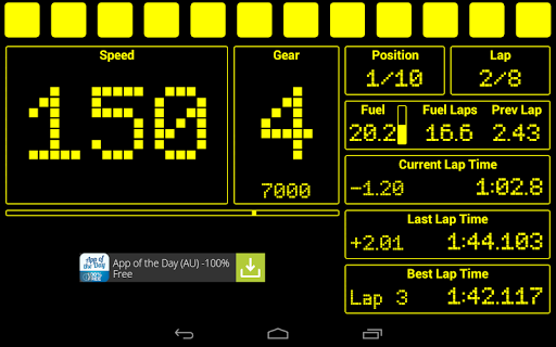 It enables your phone or tablet to display Speed, Gear, RPM, Position, Lap, Fuel, Fuel Laps Remaining, Fuel Last Lap, Current Lap Time, Last Lap Time, Best Lap Time and Track Position.