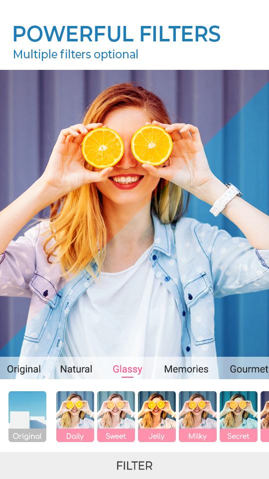 ◇ Beauty Camera take a candy selfie plus with HD Camera, or choose a photo from gallery, dozens of face filters and makeup effects help you beautify photos in a smart way.