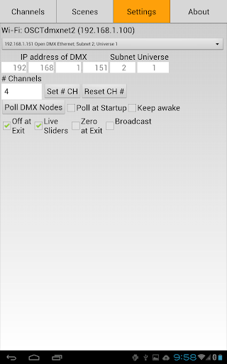 To accomplish this the application automatically detects available IP addresses and ports for the DMX/Ethernet converter into this app. This converter is something similar to an ENTTEC ODE device.