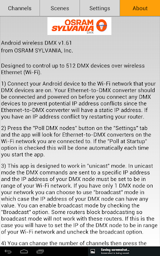 The OSRAM DMX Wi-Fi Controller application is an implementation of the DMX protocol using ArtNet II UDP unicast mode. Up to 512 devices and 16 universes can be controlled with this application.