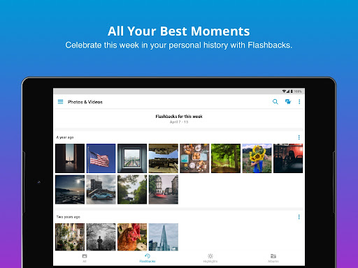 - Memories that surprise you in the future - Reconnect with meaningful videos and photos from past events, parties and vacations with Flashbacks;