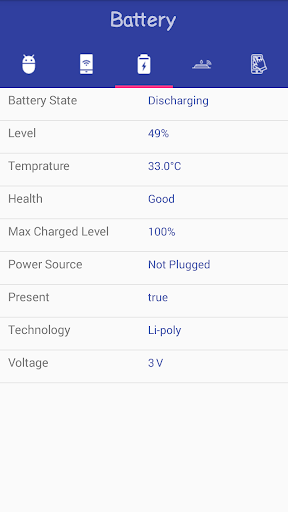 - Battery Info: Battery Level, Temperature, Helth, Battery Capacity