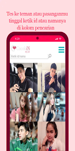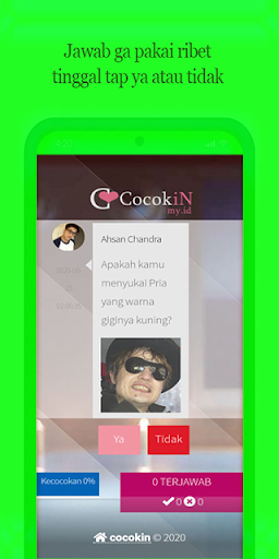 COCOKINMYID adalah aplikasi Tes Kecocokan dan cari jodoh pendamping hidup seindonesia. Buat yang jomblo bisa cari pasangan lewat aplikasi ini. Cari orang yang cocok denganmu lalu tes kecocokannya.