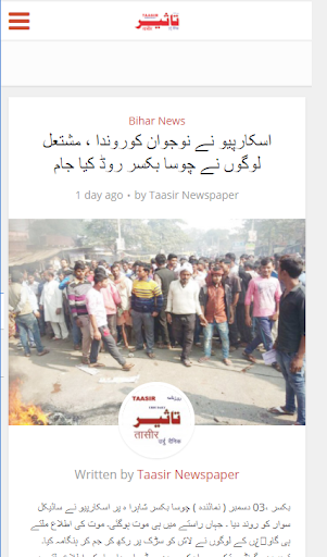 "TAASIR" is a multi edition and one of the leading National Urdu dailies of India. Taasir was first launched at Patna the capital city of Bihar. First issue of Taasir was published on 5th January 2013 and circulated within the city only. Gradually more and more readers began to like the News contents of Taasir and fascinated with its nice look as which was being published not only on broad sheet but also on internet as epaper. In this way in a very short span of time, readers of all corners of Bihar started to search this paper in the market and requested to supply the same to their regular hawkers. Readers, where Taasir was not reaching on that moment began to read this Newspaper online to satiate themselves. In this way from one to others popularity of Taasir started to reach outside Bihar state and then the publisher of this Newspaper started its edition from the Capital of India i.e. New Delhi. After this Taasir did not see back and went on running to cover other States of India in view of demand from the readers.
