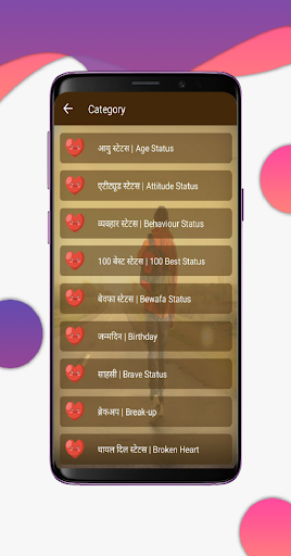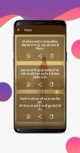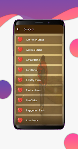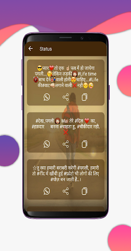 This app contains following category like Dhokha Status, Attitude Status, Sad Status, Bewafa Status, Break-up Status, Dekh Pagli Status, Diwali Status, Love Status, Family Status, Father Status, Festivals Status, Friendship Status, Life Status, Mohabbat Status, ishq Status,True Love Status, Missing You Status, Mother Status, Kiss Status.
