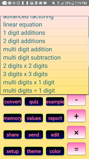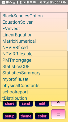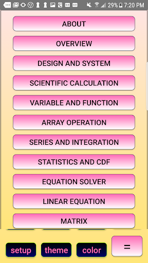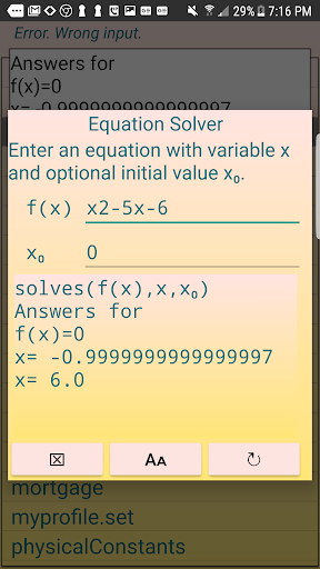 Calculations and definitions are done when ‘=’ or ‘↻’ button is entered. All variables and function definitions are stored as text and evaluated only when needed. Each line is split into the first term and the rest. The first term is calculated and added to a stack. This reduction process is repeated recursively until the last term is handled. The rest of the lines are handled in the same way until the end of lines. Most of the mathematical functions yield one answer. However, some functions yield multiple answers with text explanation as needed. System-related commands are mixed with functions with the same format for consistency. Math keyboard is provided to program efficiently in addition to a system-level soft keypad. Reports and formulas can be shared through e-mails or other communication methods. Unit conversion, math quiz, memo, and programming capabilities are unique features among many others.